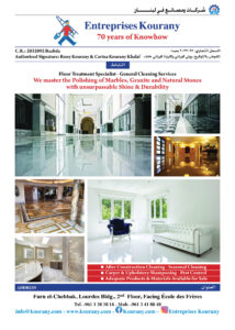 Floor Treatment Specialist - General Cleaning Services We master the Polishing of Marbles, Granite and Natural Stones with unsurpassable Shine & Durability Facebook: Kourany.com Instagram: Entreprises Kourany