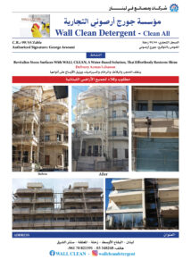 ينظف الحجر، والبلاط، والرخام، والسيراميك، ويزيل الأوساخ على أنواعها Revitalize Stone Surfaces With WALL CLEAN, A Water-Based Solution, That Effortlessly Restores Shine Delivery Across Lebanon Facebook: WALL CLEAN Instagram: wallcleandetergent